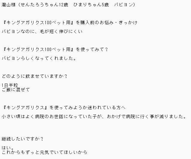お客様にアンケートに答えていただきました。 ↓ 瀧山様(せんたろうちゃん 12歳 ひまりちゃん 5歳 パピヨン) 『キングアガリクス100ペット用』を購入前のお悩み・きっかけ パピヨンなのに、毛が短く伸びに…