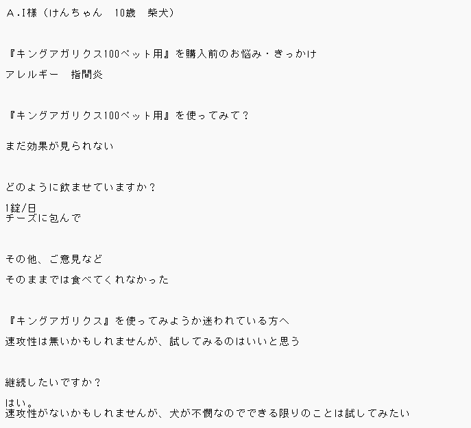 お客様にアンケートに答えていただきました。 ↓ A.I様(けんちゃん 10歳 柴犬) 『キングアガリクス100ペット用』を購入前のお悩み・きっかけ アレルギー 指間炎 『キングアガリクス100…