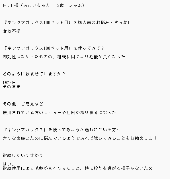 お客様にアンケートに答えていただきました。 ↓ H.T様(あおいちゃん 13歳 シャム) 『キングアガリクス100ペット用』を購入前のお悩み・きっかけ 食欲不振 『キングアガリクス100ペット…
