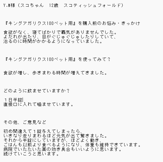 お客様にアンケートに答えていただきました。 ↓ Y.M様(スコちゃん 12歳 スコティッシュフォールド) 『キングアガリクス100ペット用』を購入前のお悩み・きっかけ 食欲がなく、寝てばかりで覇気がありませ…