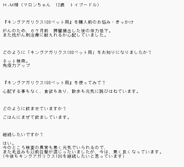 お客様にアンケートに答えていただきました。 ↓ H.M様(マロンちゃん 12歳 トイプードル) 『キングアガリクス100ペット用』を購入前のお悩み・きっかけ がんのため、6ケ月前 脾臓摘出した後の体力低下。…