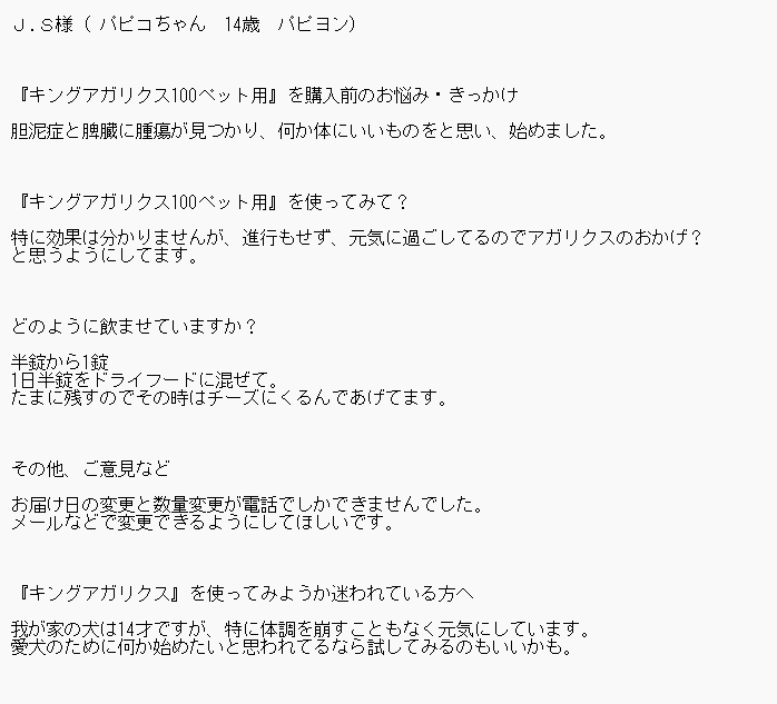 お客様にアンケートに答えていただきました。 ↓ J.S様( パピコちゃん 14歳 パピヨン) 『キングアガリクス100ペット用』を購入前のお悩み・きっかけ 胆泥症と脾臓に腫瘍が見つかり、何か体に良いことをと思い始めました…