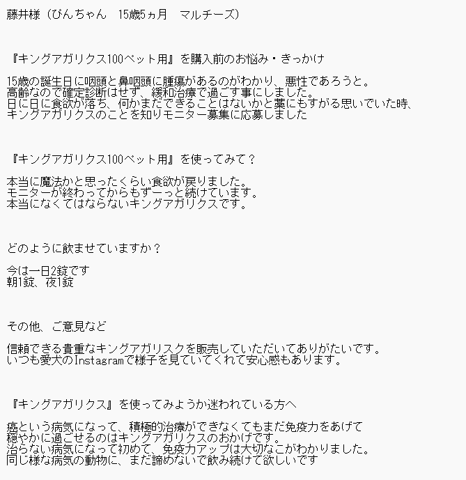 お客様にアンケートに答えていただきました。 ↓ 藤井様(ぴんちゃん 15歳5ヵ月 マルチーズ) 『キングアガリクス100ペット用』を購入前のお悩み・きっかけ 15歳の誕生日に咽頭と鼻咽頭に腫瘍があることが分かりました。 …