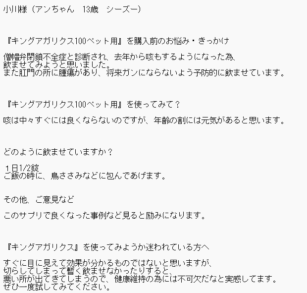 お客様にアンケートに答えていただきました。 ↓ 小川様(アンちゃん 13歳 シーズー) 『キングアガリクス100ペット用』を購入前のお悩み・きっかけ 病気と診断され、去年から咳もするようになったため飲ませてみようと思いま…