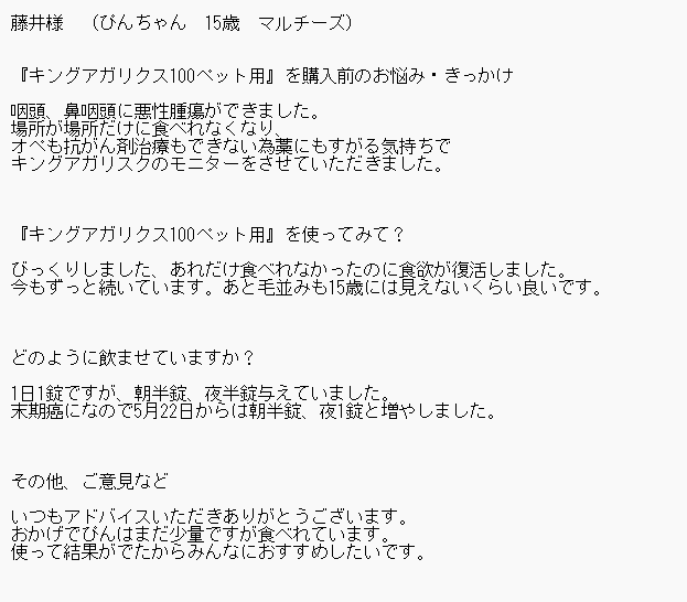 お客様にアンケートに答えていただきました。 ↓ 藤井様 (ぴんちゃん 15歳 マルチーズ) 『キングアガリクス100ペット用』を購入前のお悩み・きっかけ 咽頭、鼻咽頭に腫瘍が見つかりました。 場所が場所だけに食べづらくな…