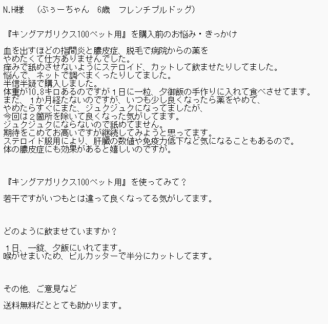 お客様にアンケートに答えていただきました。 ↓ N.H様 (ぷぅーちゃん 6歳 フレンチブルドッグ) 『キングアガリクス100ペット用』を購入前のお悩み・きっかけ 血が出るほどの指間炎や膿皮症、脱毛があり、病院からのお薬…