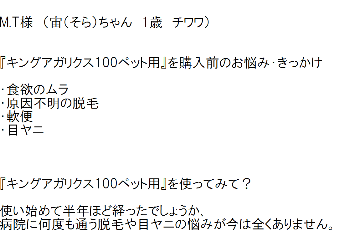 お客様にアンケートに答えていただきました。 ↓ M.T様 (宙(そら)ちゃん 1歳 チワワ) 『キングアガリクス100ペット用』を購入前のお悩み・きっかけ ・食欲のムラ ・原因不明の脱毛 ・軟便 ・目ヤニ 『キングアガリ…