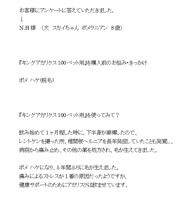 お客様にアンケートに答えていただきました。 ↓ N.H様 (犬 スカイちゃん ポメラニアン 8歳) 『キングアガリクス100ペット用』を購入前のお悩み・きっかけ ポメ ハゲ(脱毛)が気になっていました まずはサンプルか…