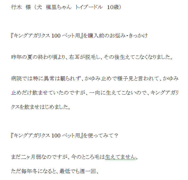 お客様にアンケートに答えていただきました。 ↓ 行木 様 (犬 楓里ちゃん トイプードル 10歳) 『キングアガリクス100ペット用』を購入前のお悩み・きっかけ 昨年の夏の終わり頃より、右耳の被毛が薄くなり、その後なかな…