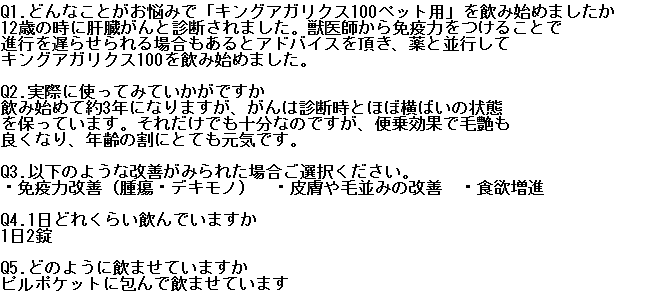 お客様にアンケートに答えていただきました。 ↓ 髙山様 (犬 オレオちゃん スコティッシュフォールド 2歳) 『キングアガリクス100ペット用』を購入前のお悩み・きっかけ 口内炎でよだれが出ていました 『キングアガリク…