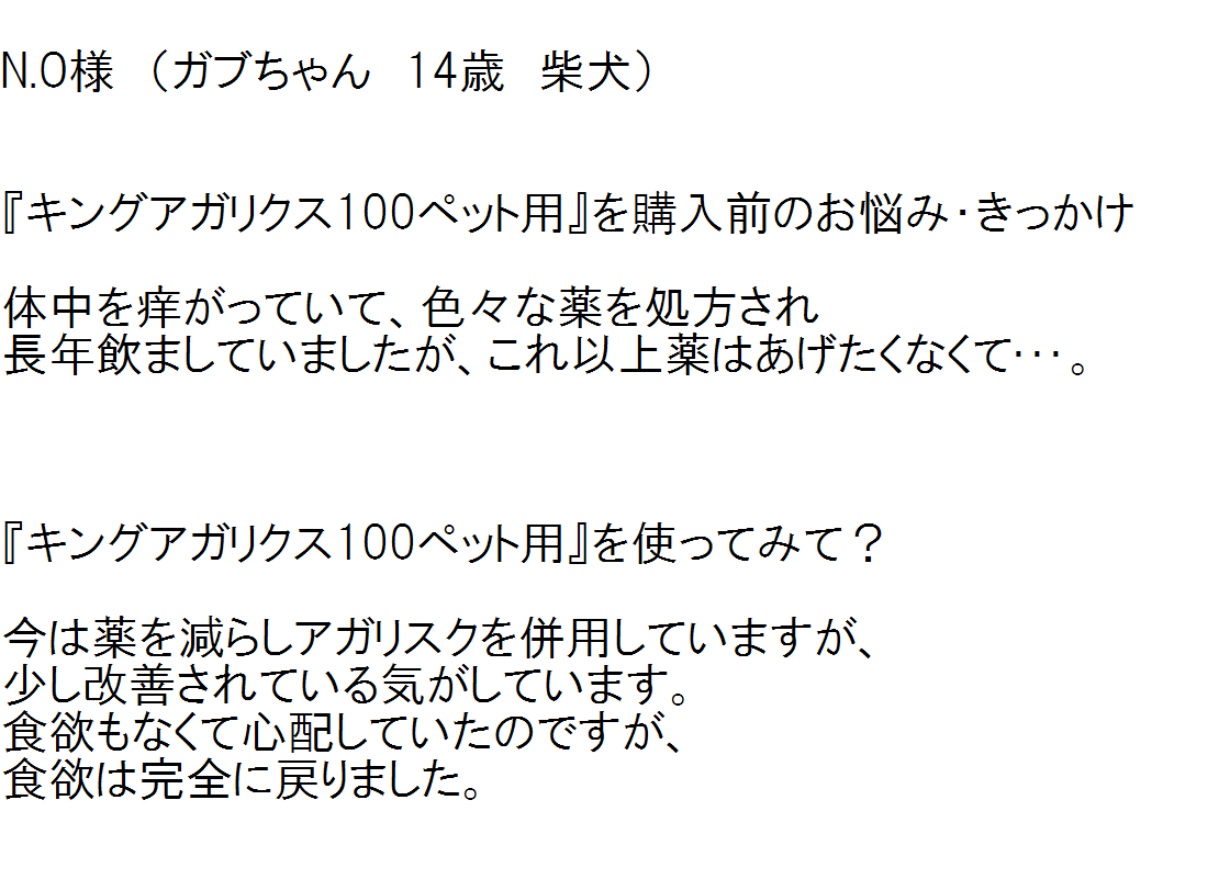 お客様にアンケートに答えていただきました。 ↓ N.O様 (ガブちゃん 14歳 柴犬) 『キングアガリクス100ペット用』を購入前のお悩み・きっかけ 体中を痒がっていて、色々な薬を処方され 長年飲ましていましたが、これ以…