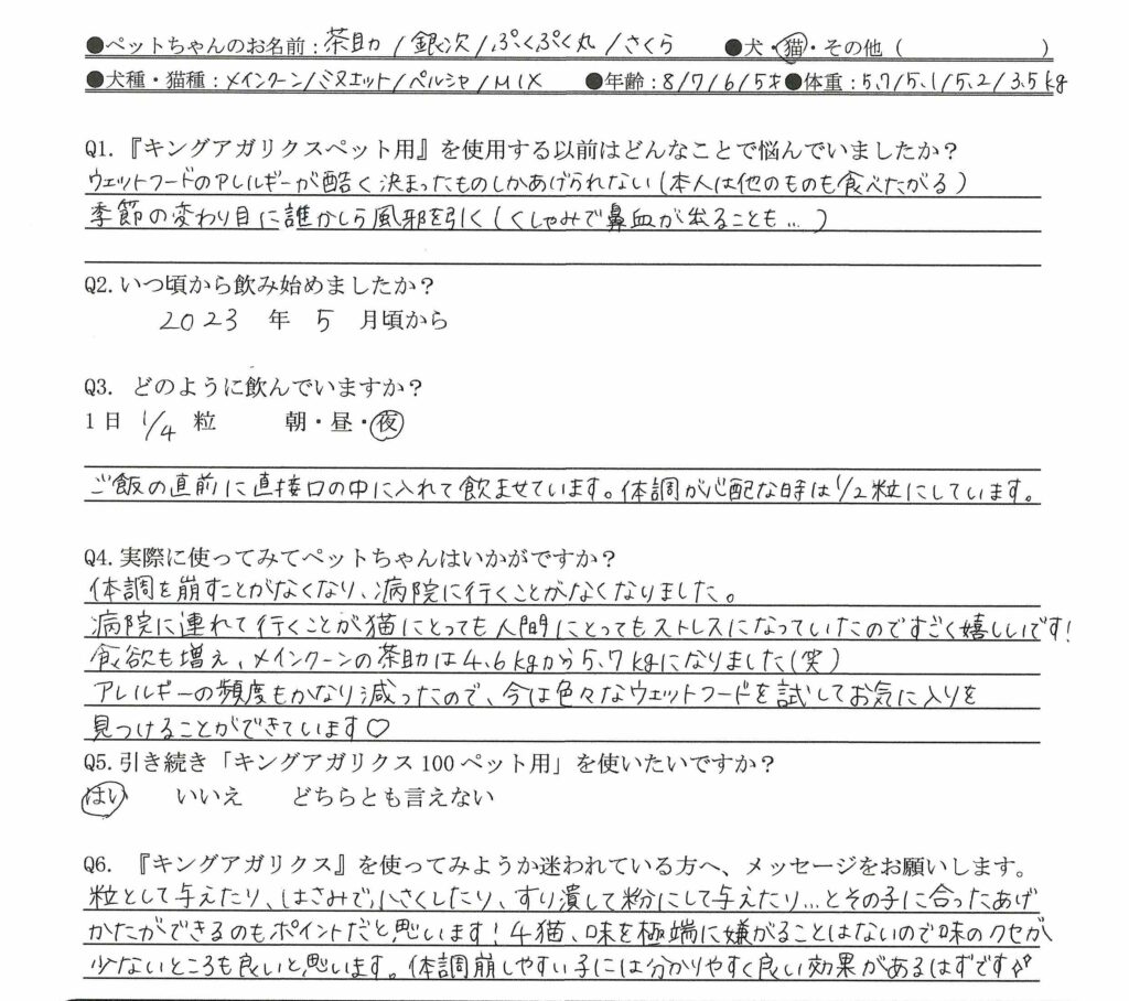 茶助ちゃんたちは、アレルギーや季節の変わり目の体調変化が気になったことをきっかけに、2023年5月からキングアガリクス100を取り入れてくださいました。